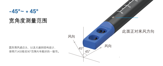 對于熱式風速測試原理,環境溫度(風溫)變化是影響測試精度的主要因素之一,即能夠在更寬的溫度范圍內保證測試精度。JT1400系列采用物理補償和風溫實時補償雙重溫度補償,實現了穩定可靠的精確修正,實現了高精度的測試。JT1433繼承JT1430系列傳感器的技術基因,保留雙重補償,解決了空氣溫度變化引起的大幅度誤差,實現了高穩定、高精度的風速測試。