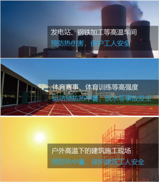 ? ? ? ?氣象學上一般把日最高氣溫≥35℃時稱為高溫。在職業衛生領域,高溫作業指在生產勞動過程中工作地點平均濕球黑球溫度指數≥25℃的作業。濕球黑球溫度(WBGT)是一個綜合評價人體接觸熱負荷的測量指標,其綜合了高氣溫、熱輻射、空氣濕度對人體的影響,單位也是攝氏度(℃)。