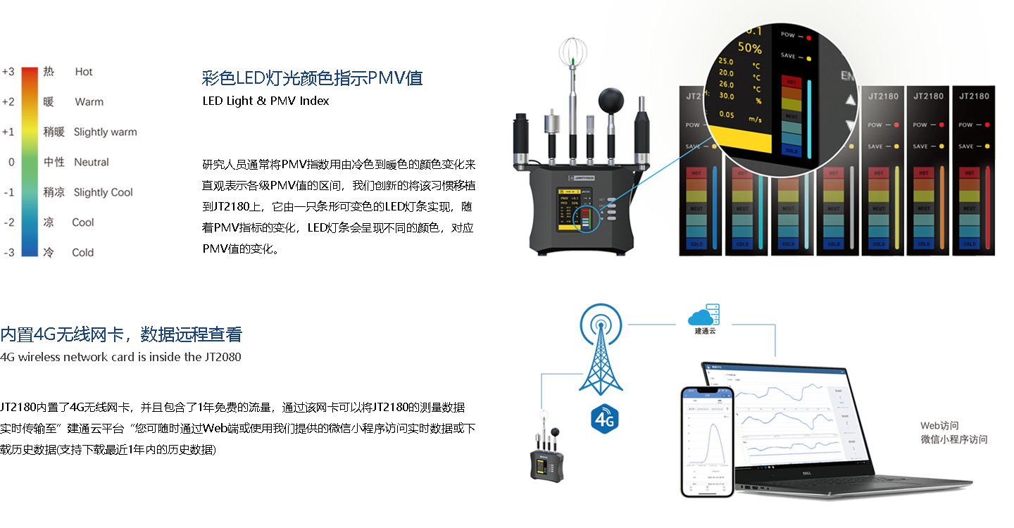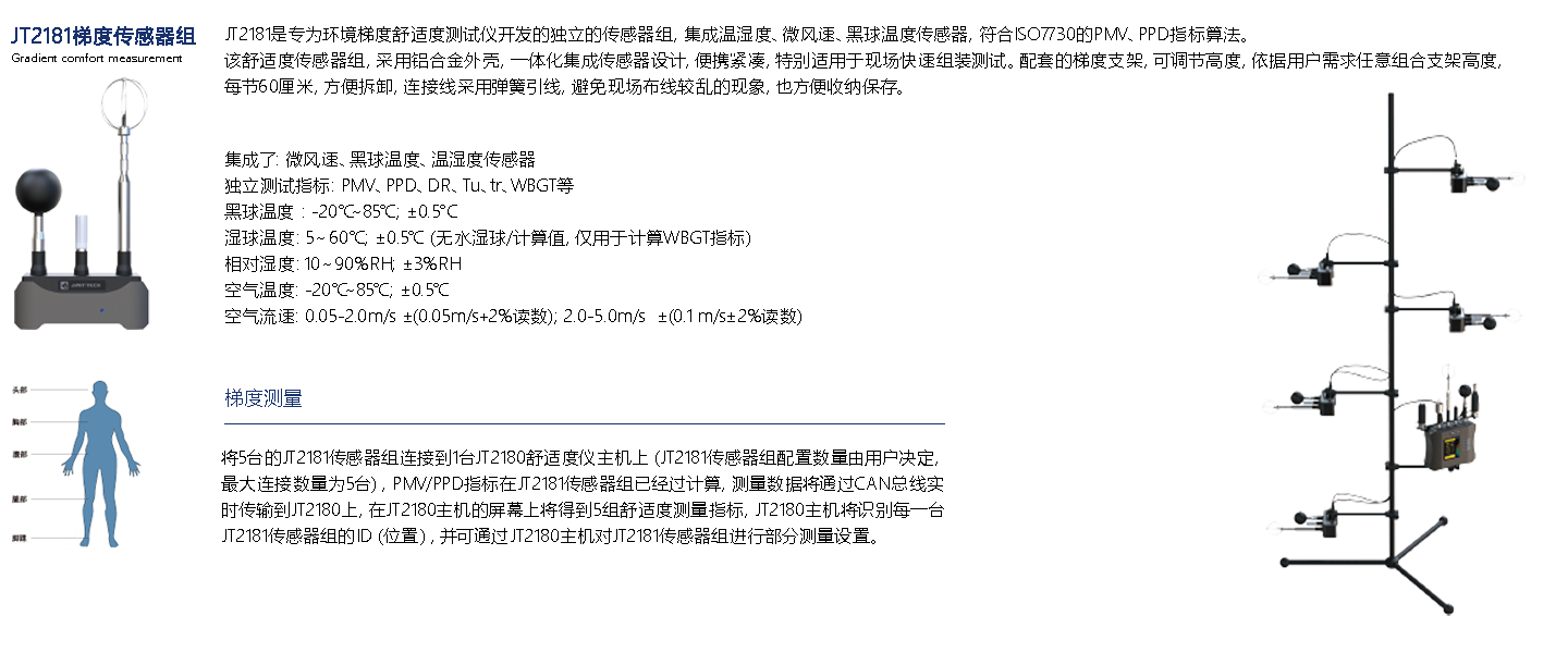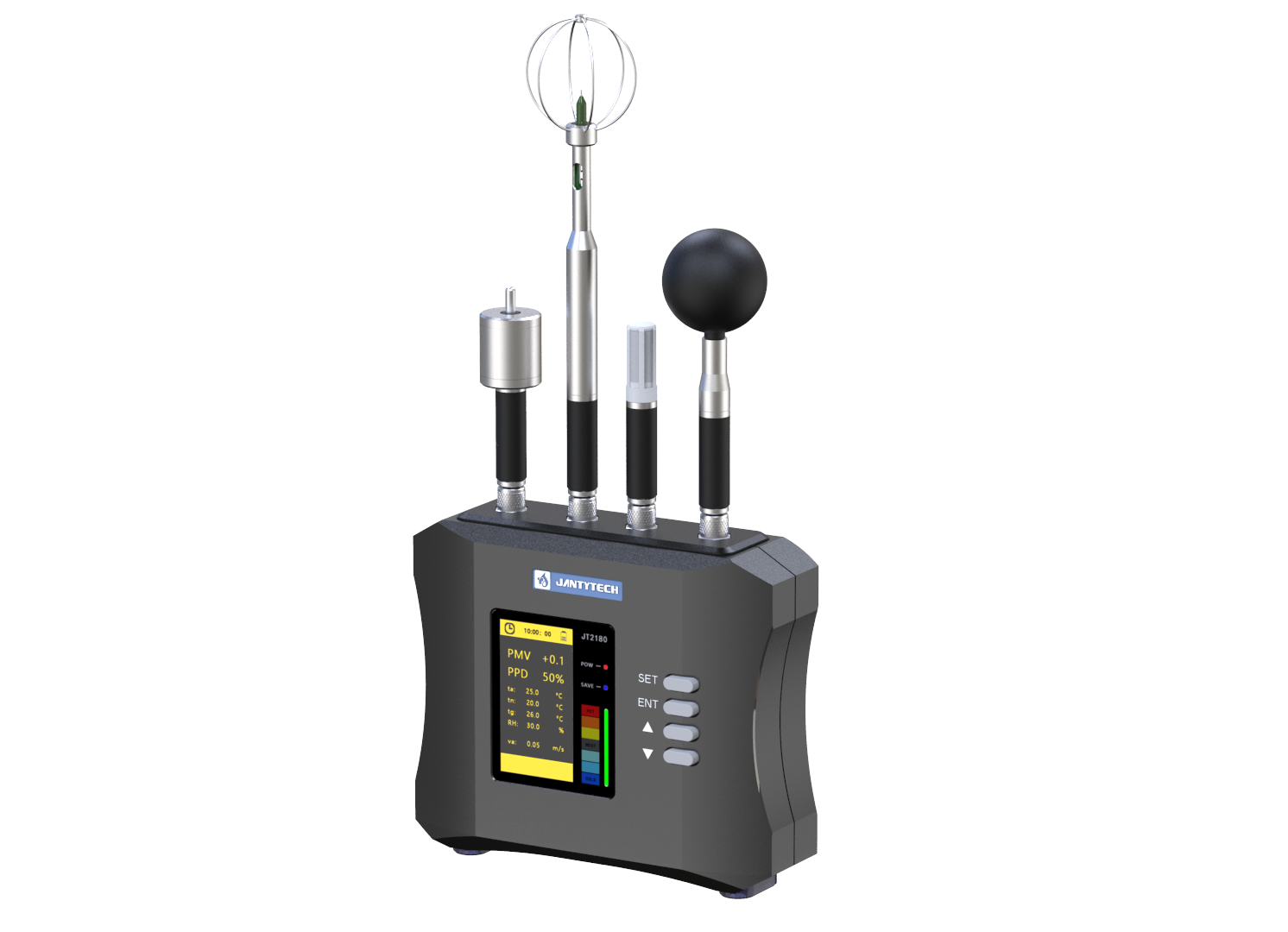 JT2180是一款便攜式環(huán)境熱舒適度測試儀,集成溫度、濕度、風(fēng)速、黑球溫度、濕球溫度等傳感器,符合ISO7730的PMV、PPD指標(biāo)算法。同時集成了PM2.5、CO2傳感器,作為室內(nèi)空氣質(zhì)量測試的重要參考指標(biāo)。