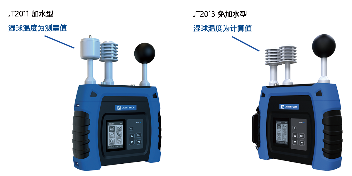 JT2011及JT2013是“建通科技”自主開發的高精度熱指數測試儀器,可同時測試空氣溫度、濕球溫度、輻射溫度。本測試儀采用目前最先進的數字溫度傳感器作為溫度采集端,配置我公司自主開發的標準50mm、150mm輻射黑球,完全符合ISO及國家相關標準,并能通過國家計量院檢定。 JT2011采用常規加水式濕球溫度傳感器,直接測得濕球溫度,JT2013采用免加水式濕球溫度,可保證長期在線測量而無需擔心濕球溫度的水量不足,兩個型號的儀器均已內置相對濕度傳感器,能夠實時顯示空氣的相對濕度,且均可以配置50mm或150mm黑球球體,以保證不同使用場景的測試需求,485通訊接口能夠更輕松的接入您的工控設備或控制裝置,也可以通過該接口實現測量數據的下載與導出。