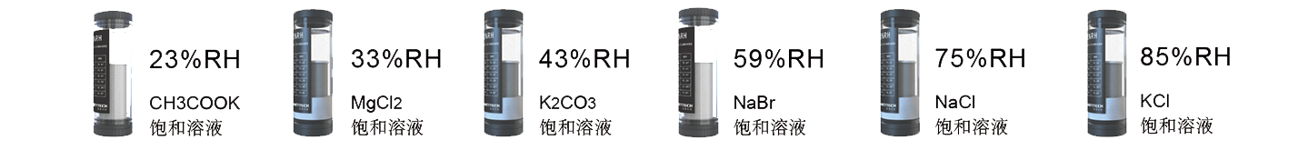 33%~85%RH 6種飽和鹽溶液,提供6個不同的相對濕度校準點。