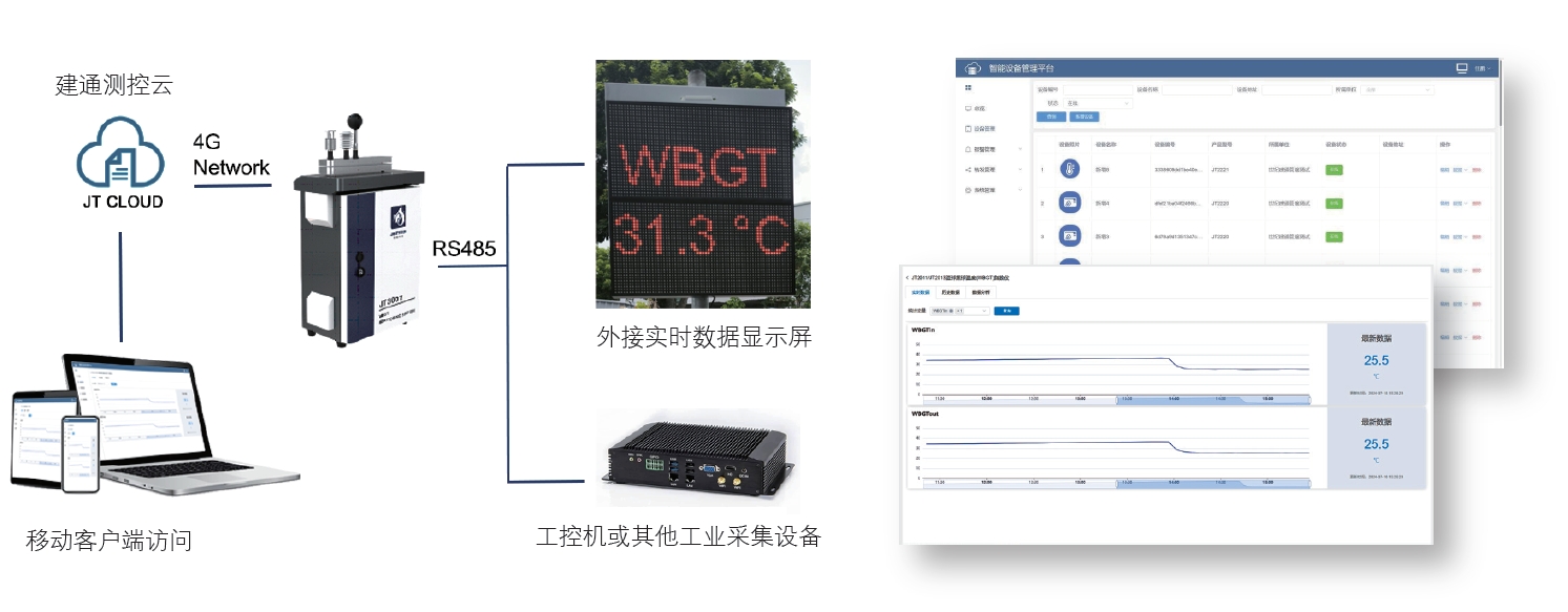 JT3007 WBGT指數監測預警儀是專用于室外的一種在線環境熱壓力WBGT指數監測站。該儀器依據標準ISO 7243:2017適用于評估在工作日(最多8小時)的總暴露期間內,熱環境對作業者的影響程度。也適用于室內外職業環境及其他類型環境的評價和預警。該設備能夠完成測試干球溫度、黑球溫度、濕球溫度、相對濕度、WBGTo(室外)、WBGTi(室內)指標測試。