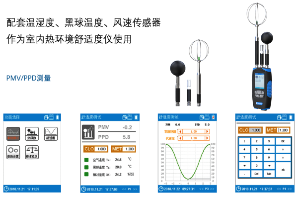 作為室內(nèi)舒適度測(cè)試儀評(píng)價(jià) PMV PPD指標(biāo) 同時(shí)測(cè)量并記錄的參數(shù)包括:空氣溫度,相對(duì)濕度,黑球溫度,微風(fēng)速。 PMV/PPD計(jì)算所必要的非測(cè)量參數(shù),可以通過(guò)屏幕進(jìn)行輸入,包括服裝熱阻,代謝率等。 PMV 和PPD 的計(jì)算是根據(jù)ISO 7730 ( GB/T18049-2000) 標(biāo)準(zhǔn)的舒適度評(píng)估指標(biāo) PMV ( 預(yù)測(cè)平均熱感覺指數(shù)) 用于評(píng)估同一環(huán)境下大多數(shù)人的熱感覺。計(jì)算結(jié)果以+3 ( 熱)~-3 ( 冷) 之間的數(shù)字表示 PPD ( 預(yù)測(cè)不滿意者百分?jǐn)?shù)) 表示同一環(huán)境下,人群對(duì)熱環(huán)境的不滿意度,用百分?jǐn)?shù)表示 執(zhí)行標(biāo)準(zhǔn): ISO 7730、GB/T18049-2000 技術(shù)規(guī)格: 2020-11黑球溫度探頭: 測(cè)量范圍:0~120℃ 精度:±0.5℃ 分辨率:0.1℃ 傳感器類型:數(shù)字芯片(不銹鋼封裝) 2020-16 溫濕度探頭: 溫度測(cè)量范圍:-20~120℃ 精度:±0.5℃ 分辨率:0.1℃ 濕度測(cè)量范圍:0~100%RH 精度:±3% 2020-21微風(fēng)速傳感器探頭: 測(cè)量范圍:0-10m/s 精度:0.05-2m/s:±(0.05+2%讀數(shù)) >2m/s:±(0.1+2%讀數(shù)) 分辨率:0.01m/s 輸出:RS485 計(jì)算值:PMV、PPD 可輸入的服裝熱阻值、新陳代謝率 儀器顯示PMV與PPD關(guān)系曲線